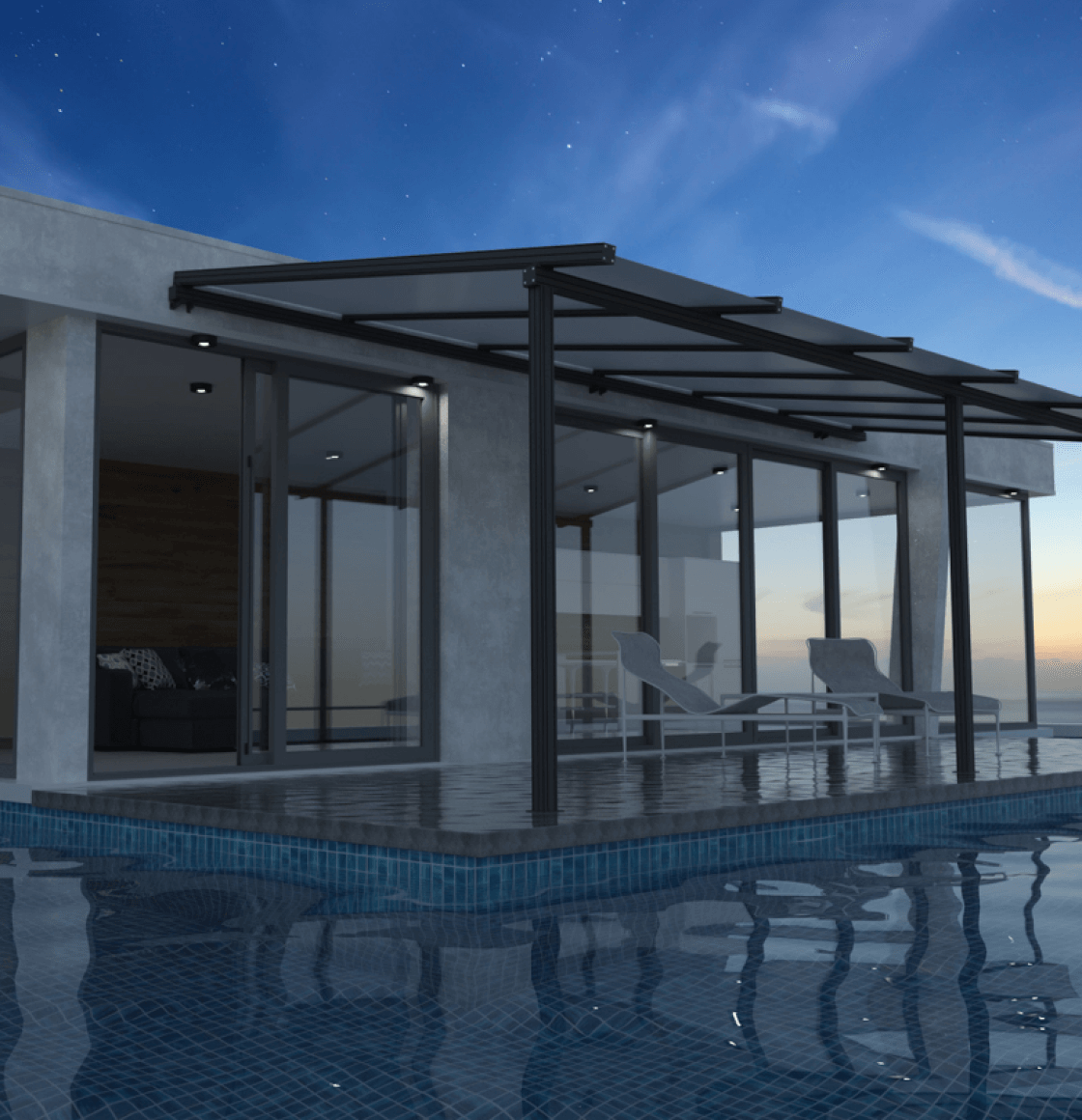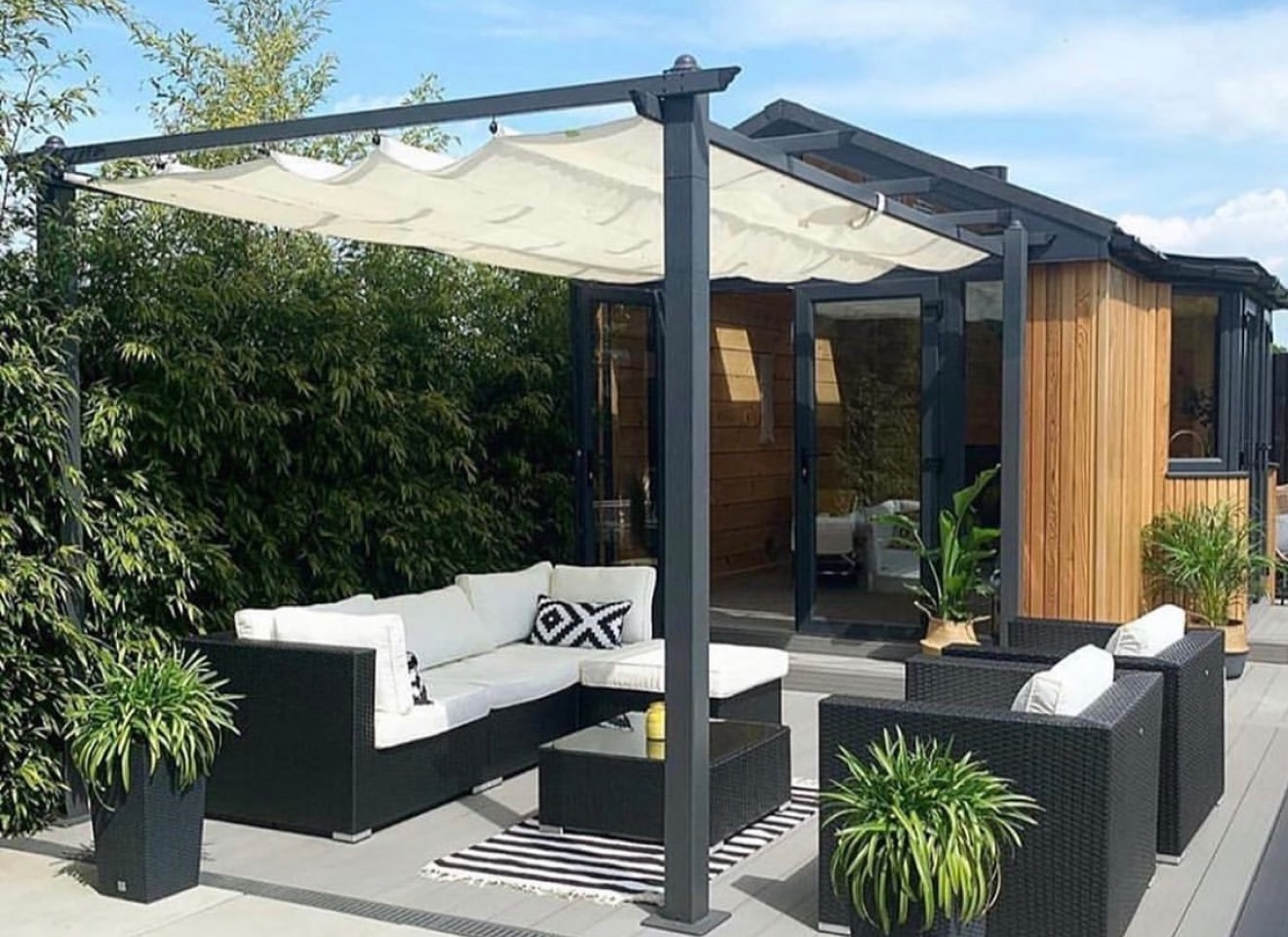 Пергола линейки Lite – Sigma. Система со сдвижной кровлей позволяет быстро создать уютную лаунж зону на террасе и защитить ее от солнца, легкого и среднего дождя*.